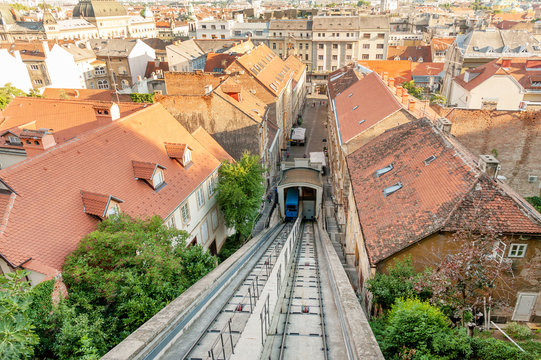 Panoramic view of Zagreb, Tomic street and Zagreb funicular connecting Lower and Upper historic parts of the city, Croatia
