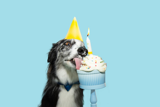 Portrait border collie dog celerbating birthday or anniversary with a colorful cup cake. Isolated on blue pastel background