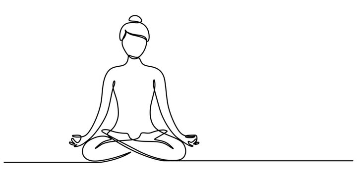 Single line drawing of a girl sitting in a yoga pose. Doodle illustration of relaxing workout, One continuous single line of woman sitting yoga isolated on white background, Person sitting in lotus.