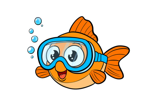 A picture of a fish in a swimming mask on a transparent background. Orange fish in png format