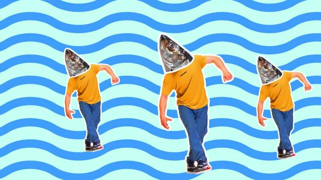 In an orange studio, a man confidently poses in a suit with a unique and eccentric fish head hat, showcasing his creative fashion style.