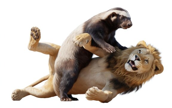 humorous scene of a strong honey badger lifting a full-grown lion in a wrestling-style pose, as if performing a suplex move