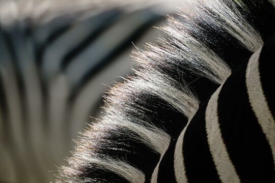 Burchells zebra (Equus quagga burchellii) mane and fur in black and white, pattern, Mosi-oa-Tunya National Park, Zambia, Africa