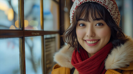 Woman enjoying hot beverage in snowy winter wonderland