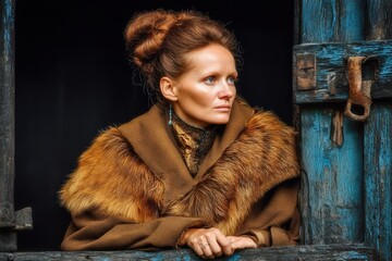 A woman in a fur shawl gazes thoughtfully out of a rustic wooden window, wearing vintage-style clothing.