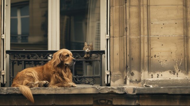 a large brown dog sitting on top of a window sill next to a cat on the other side of the window.