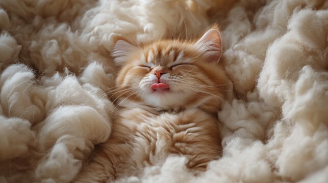 Cute orange kitten sleeping comfortably in fluffy wool on a cozy winter afternoon