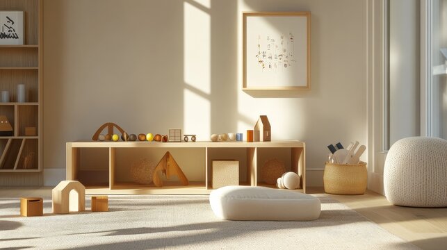 Minimalist modern playroom with clean, fun design. Featuring neutral tones and sleek furnishings