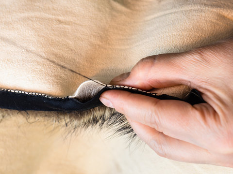 furrier stitches fur pelts using a tape close up