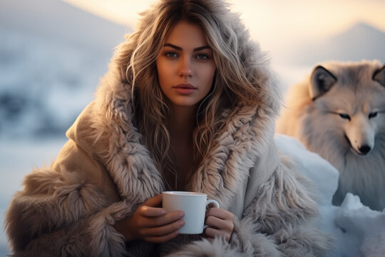 A beautiful blonde girl in a fur coat holds a cup of coffee or tea in her hands, the head of a husky dog ​​is visible behind the girl, on a blurred winter background