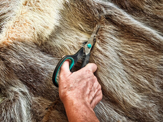 Skillful hands utilize scissors to carefully trim fur fabric in a crafting workspace during daylight hours