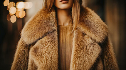 Elegant woman in a luxurious fur coat against a blurred evening backdrop