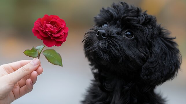 Cute dog looks at hand holding red flower in garden setting during daytime