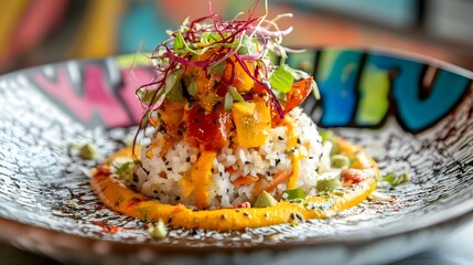 A close-up of a vibrant fusion dish, featuring elements from different cultures, served on a graffiti-covered plate