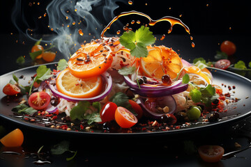 A beautifully presented dish that combines elements from different global cuisines. Fusion cuisine concept.