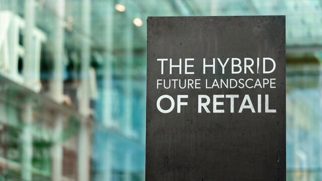 The Hybrid future landscape of retail on a city-center sign in front of a shopping center