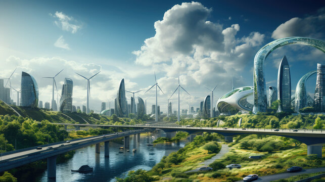 Urban sustainability initiative cityscape digital art eco-friendly environment aerial view green concepts for future living