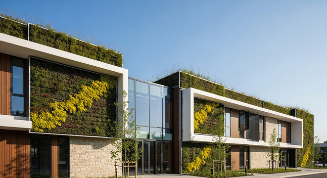 Isometric illustration of a sustainable green city featuring eco-friendly buildings with solar panels, green roofs, and active residents.