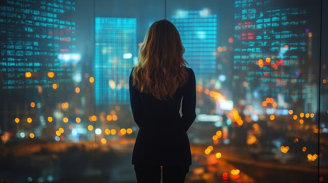 Businesswoman Analyzing Future Market Trends with Holographic Projection of Insights