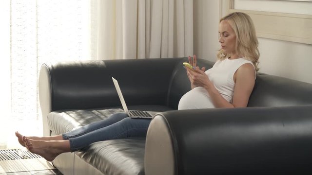 A pretty pregnant blonde sits on the sofa with a laptop and a phone. She looks at the screen, touches and scrolls it. The side view.