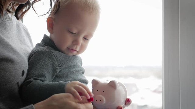 Love, mom holding baby in home and bonding with care and hug, holding hands and rocking to calm child. New mother with newborn and safety and support from woman thinking of future comfort in house.