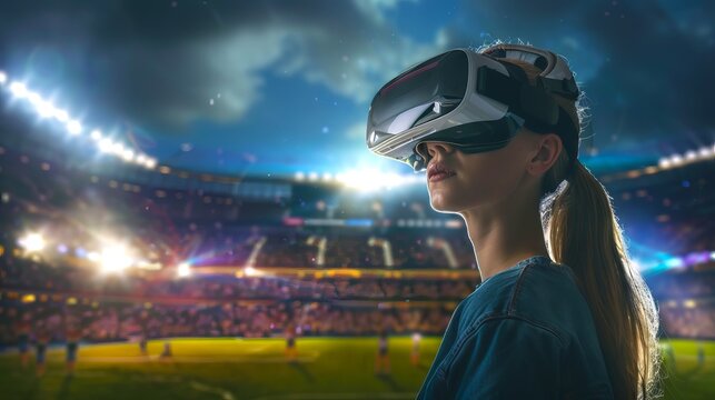 Caucasian woman using virtual reality headset in a stadium. Concept of VR technology, immersive experience, sports entertainment