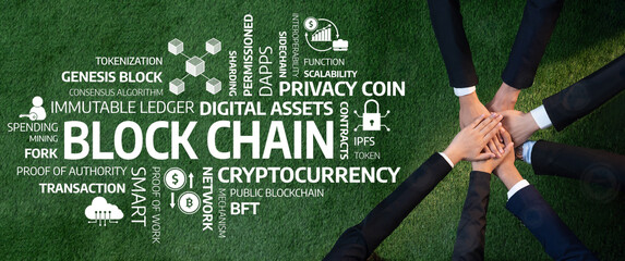 This image showcases a collaborative effort among business professionals focused on blockchain technology and digital assets, emphasizing teamwork and innovation in a modern financial landscape. Amity