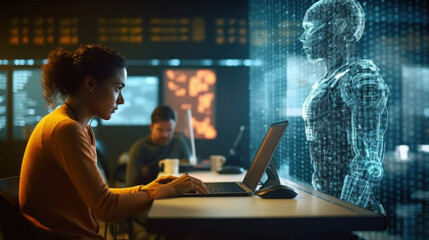 people talking with robot, Working together in the future with robots, Friendship of the future