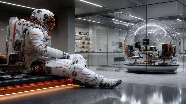Futuristic office scene with humans and robots working together in a clean minimal business environment.