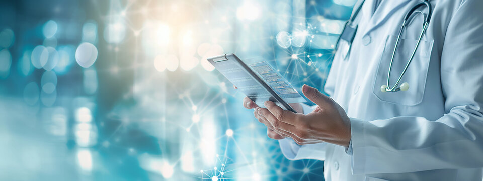 A doctor is holding an x-ray model. technological developments in the field of health, abstract expression, banner