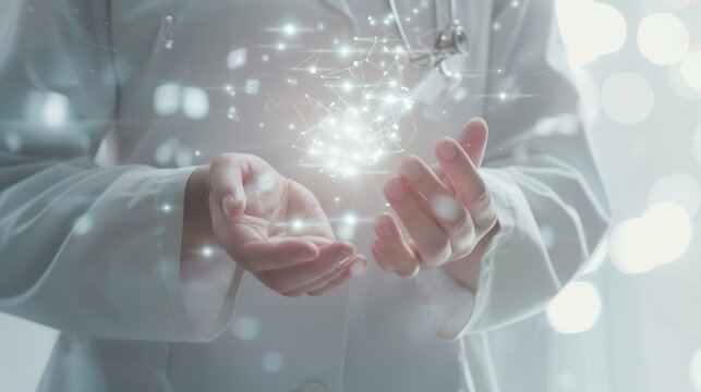 A doctor gently holding a holographic heart constellation, symbolizing the magic and care of modern medicine.