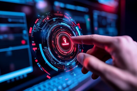 Futuristic depiction of a corporate environment where insider threats are detected by AI, with digital overlays highlighting suspicious activities in real time