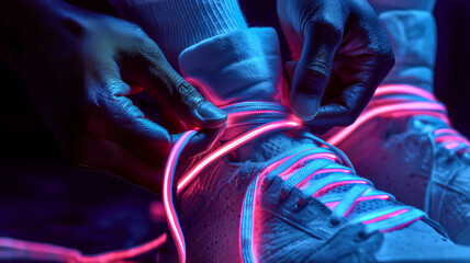 Tying illuminated shoelaces on athletic footwear. Vibrant pink and blue lighting creates a futuristic aesthetic.