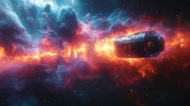 A futuristic spaceship navigates through a stunning nebula, surrounded by fiery colors and cosmic clouds.