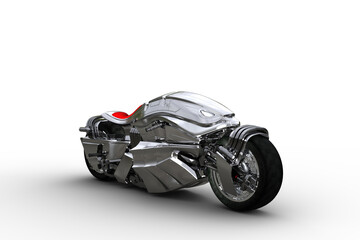 Bike with chrome engine, black futuristic motorcycle isolated on white background, side view, 3D rendering