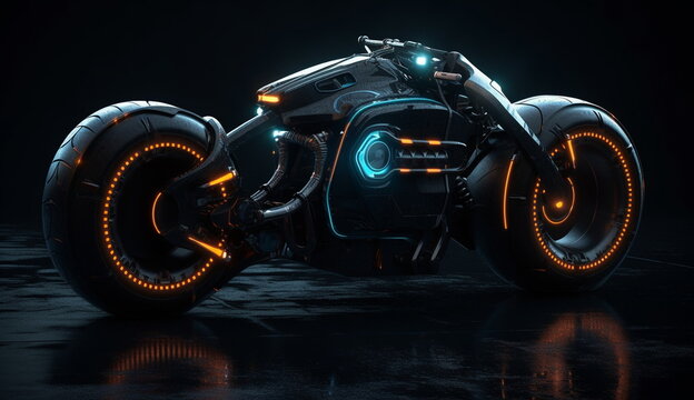 Realistic cyberpunk motorbike in dark mood. Big vehicle bike with cool futuristic design, vivid color scheme. Fictional model. Made with Generative AI