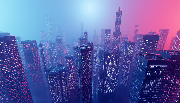 A futuristic cityscape with towering skyscrapers illuminated by neon lights,