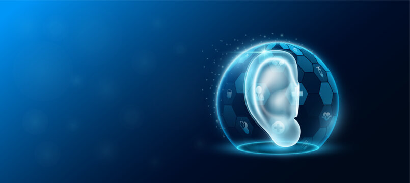 Ear human organ inside dome shield protection futuristic and medical icon transparent. Technology innovation health care. Medical science ads website banner with empty space for text. Vector.
