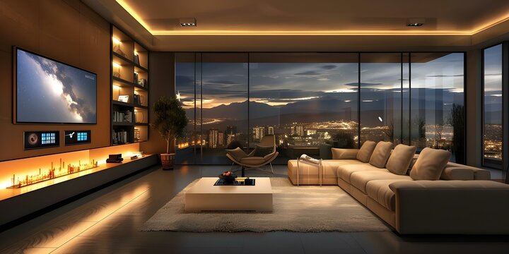 Futuristic living room with smart home features LED TV and large windows. Concept Futuristic Living Room, Smart Home Technology, LED TV, Large Windows