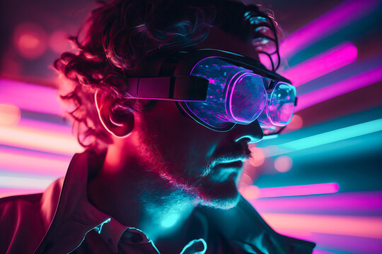 Man experiencing virtual reality with vr headset in futuristic environment