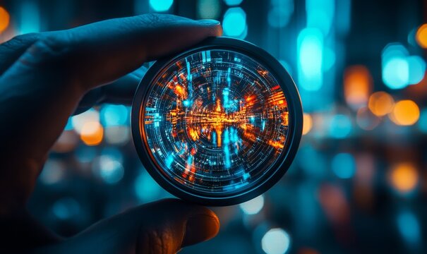 Close-up of a hand holding a futuristic VR headset, with a glimpse of a vibrant virtual world reflected in the lens, Generative AI