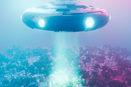 Futuristic city under alien attack, ring-shaped craft unleashing lightning