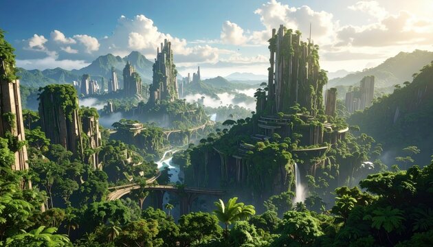 Lush overgrown ruins of a futuristic city nestled within a tropical valley, with winding paths and waterfalls cascading down the rocky slopes, create a vibrant and serene landscape under a bright sky.