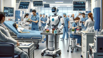 A group of doctors in white coats are working alongside a humanoid robot in a hospital setting. They are engaged in medical discussions and procedures, utilizing advanced technology to provide