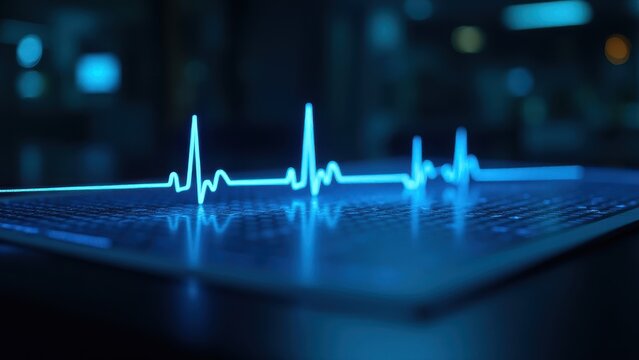 A vibrant, glowing human heart with an EKG line, symbolizing health and vitality in a futuristic setting.