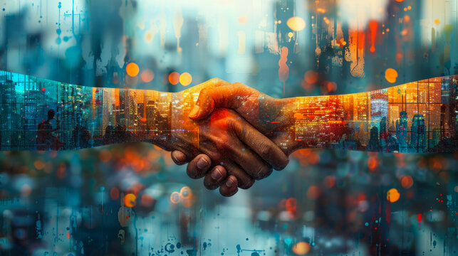 Digital partnership formation urban skyline business concept futuristic environment close-up