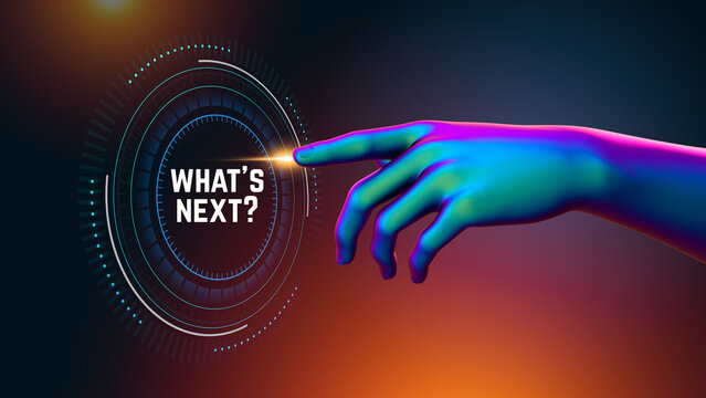 What is next question text message with 3d arm touching HUD interface for futuristic AI and IoT visualization