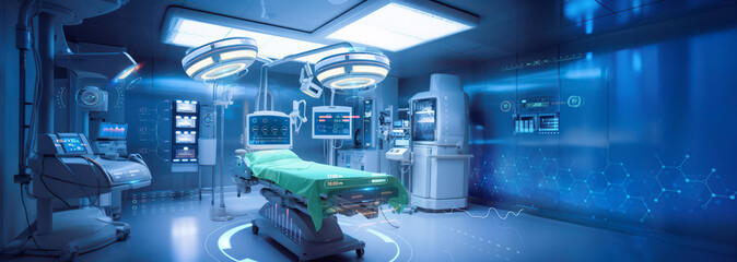 futuristic medical operation or emergency admission ER room with patient surgical diagnosis medical biometric info graphs and hospital services and equipment as wide banner with copy space area