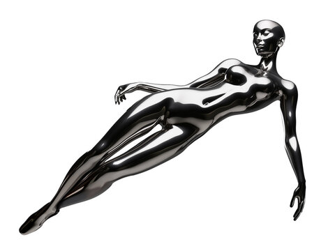 Y2K futuristic chrome woman body lay isolated. Melty gloss silver metal mannequin png