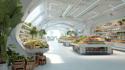 A futuristic grocery store featuring AI-powered checkout systems and showcasing fresh, locally sourced produce to promote sustainable shopping